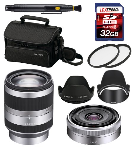 FeaturesVersatile Zoom LensAspherical elementsCircular ApertureSmooth, quiet AF MotorOptical SteadyshotTM w/ Active Mode Sony SEL18200 18-200mm F3.5-6.3 Lens (Silver) + Sony 16mm f/2.8 + Sony Bag + Sony Hood + 32GB + Filters?