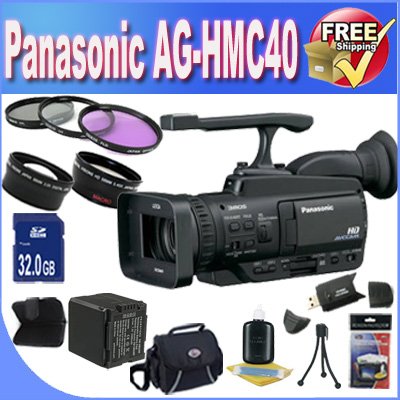 FeaturesThree newly designed 1/4.1" Progressive 3MOS Imagers for full HD resolution.Extremely slow, smooth zoom for the precise control needed for dramatic sequencesTime Date Stamp enables shooting Legal Depositions or SurveillanceThe HMC40 is a versatile HD camcorder offering high-quality AVCHD recordings and high-resolution still photo captureThe compact camera is also packed with professional video and audio features Panasonic Professional AG-HMC40 AVCHD Camcorder with 10.6 MP Still and 12x Optical Zoom + Extended Life Battery + 32GB SDHC Class 10 Memory Card + USB Card Reader + Memory Card Wallet + Shock Proof Deluxe Case + 3 Piece Professional 43mm Filter Kit + Super Wide Angle Lens + 2x Telephoto Lens + Accessory Saver Bundle!?