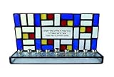 | ✚✚✚ Stained Glass Hanukkah Menorah with Hebrew Text and Four Color Mosaic This stained glass Hanukkah Menorah has Hebrew text in the center of the backsplash that is surrounded by a four color mosaic and has a wide glass block base. This handsome stained glass Hanukkah Menorah features the first blessing said when lighting Hanukkah Candles in Hebrew in the center in a traditional font on its backsplash as well as a colorful mosaic pattern. The mosaic pattern appears in blue, red, yellow and white and echoes synagogue art. The base of the Menorah features translucent glass panels that are etched with floral patterns and is also set with nine candleholders. This item is a fabulous gift for a Bar or Bat Mitzvah!