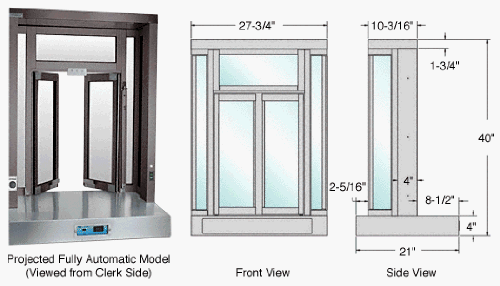 #Can not be shipped by UPS, FedEx - Common Carrier Only. Call for shipping quote. 888-663-9830 Select From Manual, Semi-Automatic and Fully Automatic Operation Low Voltage 24V DC System UL/CSA Approved Class Two Transformer CRL Bi-Fold Service Windows are perfect anywhere a high quality bi-folding window is required. Features include two panels that simultaneously open outward towards the customer and a burglar bar for extra security. Projected and Flush Mount models are available in three different configurations: MANUAL - Both panels move simultaneously as either panel is manually operated. SEMI-AUTOMATIC - Opening the window is achieved by pushing on the hip activated slide bar. Step away from the window and the two panels automatically close. FULLY AUTOMATIC - Opening the window is as easy as stepping in front of the built-in infrared sensing device. Simply step away and the two panels automatically close. The Automatic/Off/Manual Switch provides three different settings: AUTOMATIC operates with the infrared sensing device; MANUAL operates with a jamb mounted push button; OFF defeats all functions and closes the two panels. UL/CSA Approved Class 2 Transformer. Color: Duranodic Bronze Overall Size: 27-3/4 in (705 mm) Wide x 40 in (1016 mm) High Service Opening Width: 15 in (381 mm) Service Opening Height: 25 in (635 mm) Specifications: Materials: Aluminum Extrusion; Pile Weatherstrip; Glazing Vinyl; Stainless Steel Shelf or Stainless Steel Sill Glazing: 1/4 inch (6 millimeter) Clear Tempered Glass Stock Finishes: Satin Anodized or Duranodic Bronze Bi-Fold Configuration: Fully Automatic; Self-Closing; Manual To Determine Rough Opening: Add 1/2 Inch (12.7 millimeter) to Width, 1/4 Inch (6.4 millimeter) to Height Controls: Infrared Sensing Device and Manual/Off/Automatic Switch Included in Stainless Steel Shelf (attached). Jamb Mounted Push Button